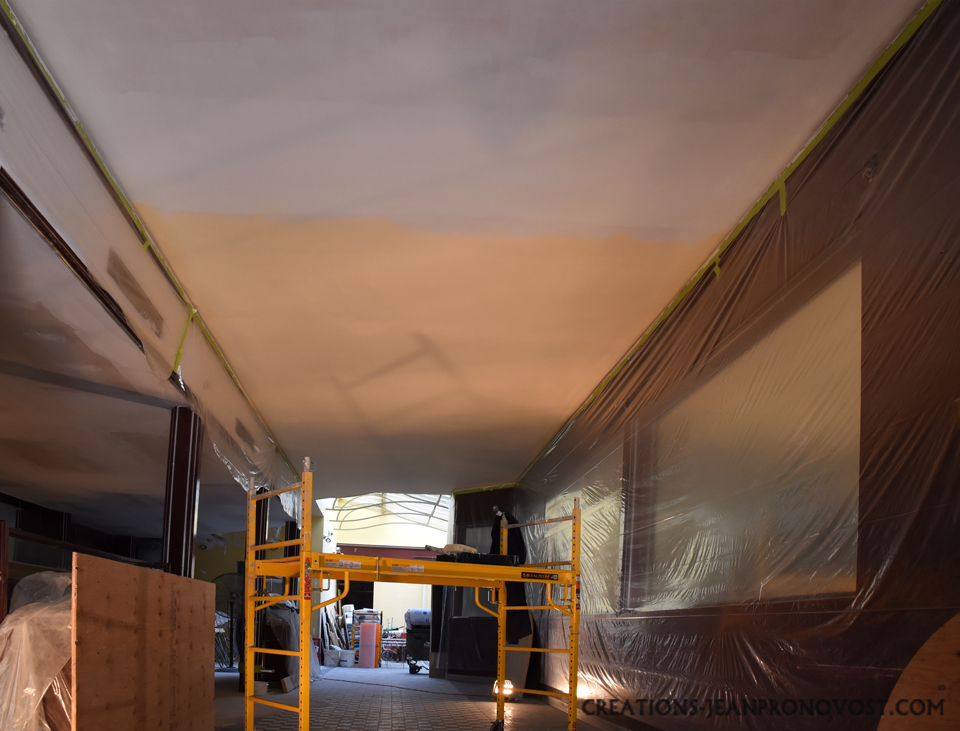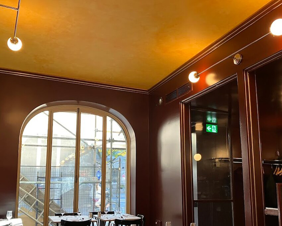 This decorative faux finish preserves the character of the space while providing a custom, aesthetic solution. The final result: a textured, authentic ceiling perfectly integrated into the restaurant’s atmosphere.
