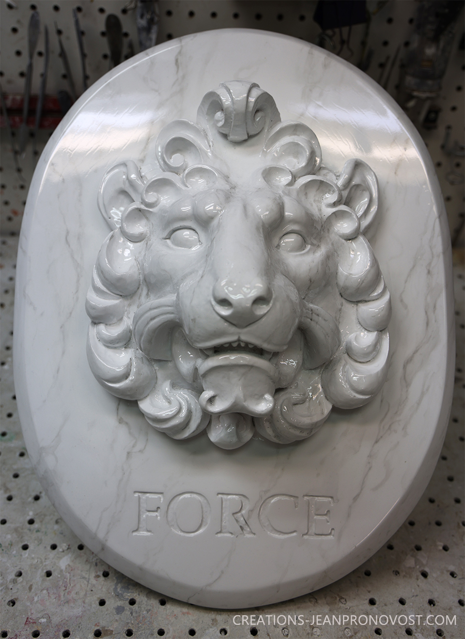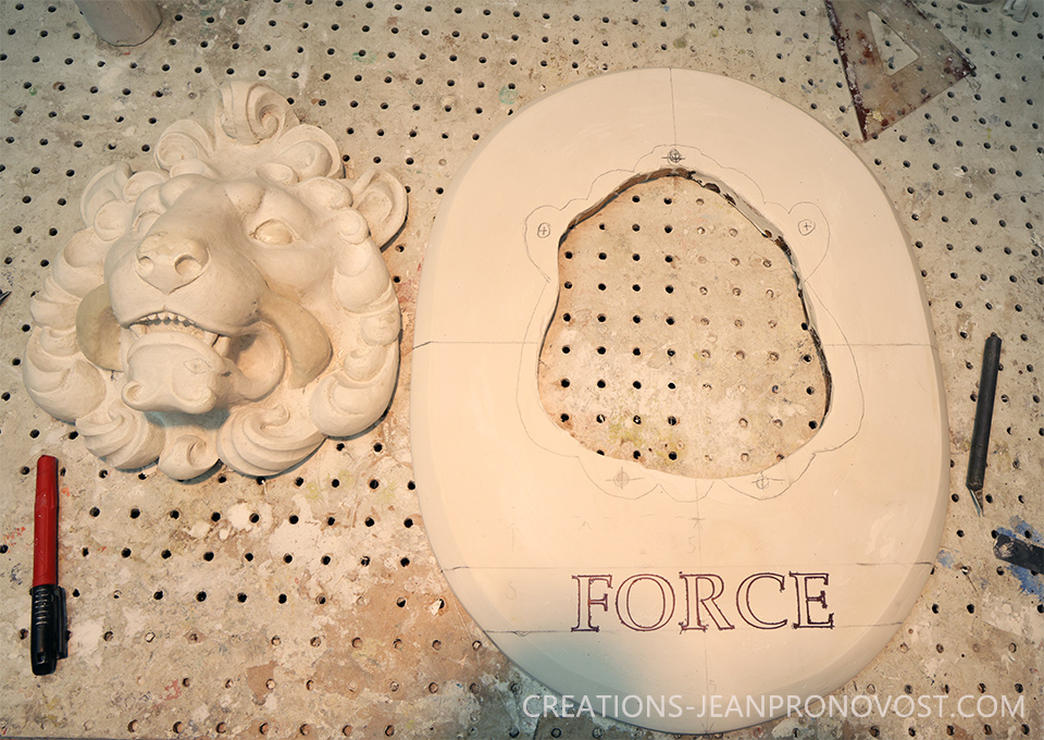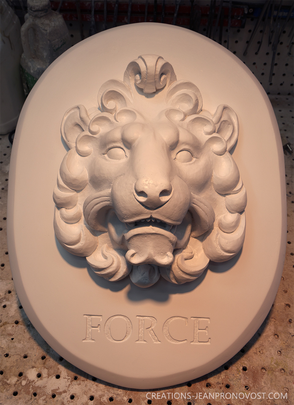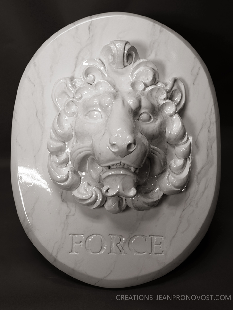 Le sculpteur québécois Jean Pronovost a conçu un lion en relief (ronde-bosse) intégré à un cadre ovale, accompagné du mot « Force » soigneusement sculpté. Cette œuvre unique met en valeur toute la noblesse et la puissance de l’animal.